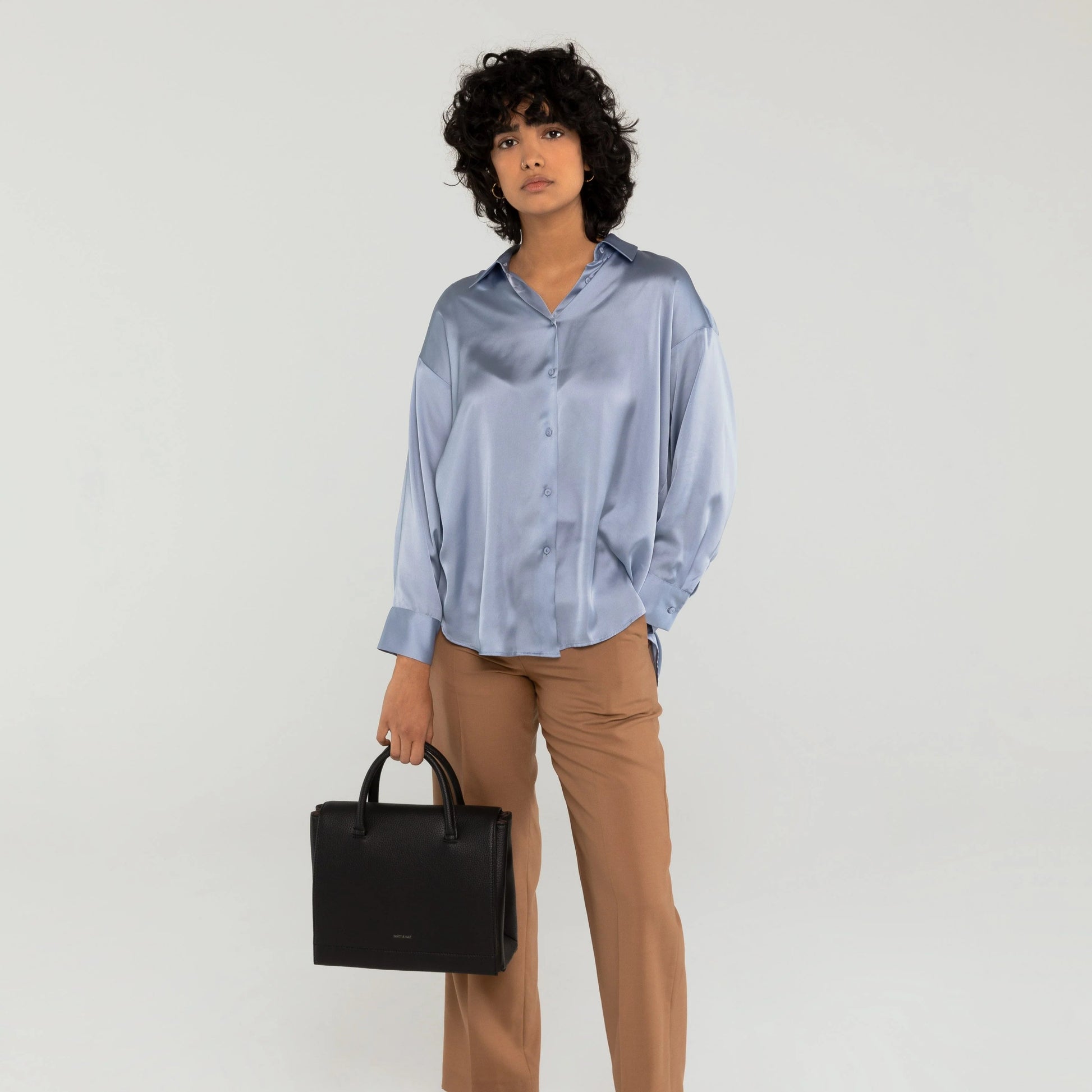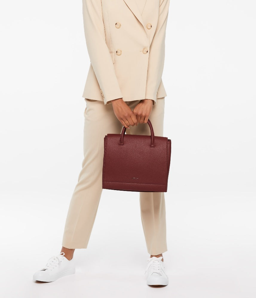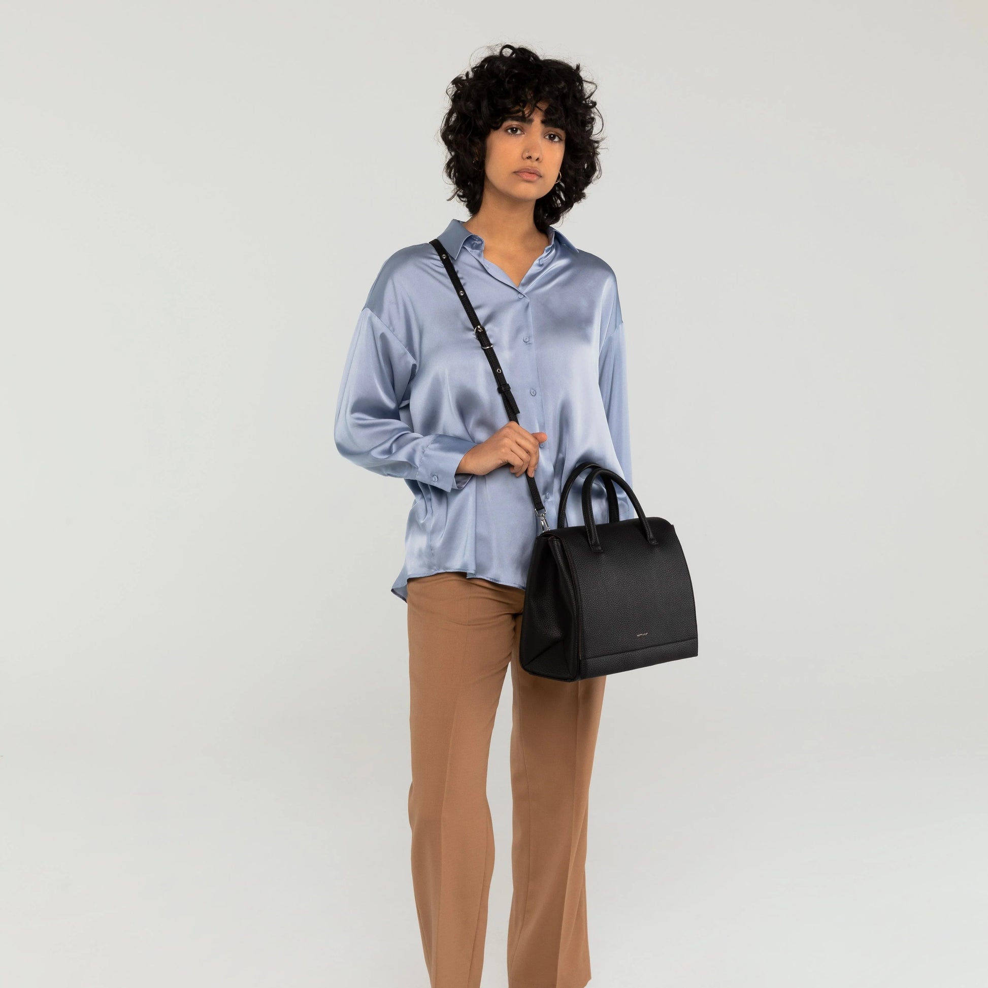 Satchel with double handles and flap closure. Comes with a detachable and adjustable crossbody strap.
