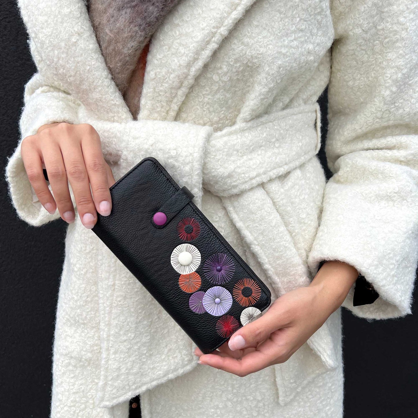 This classic wallet with a gorgeous modern, artistic, floral design fits all your bills, coins, ID’s and cards.