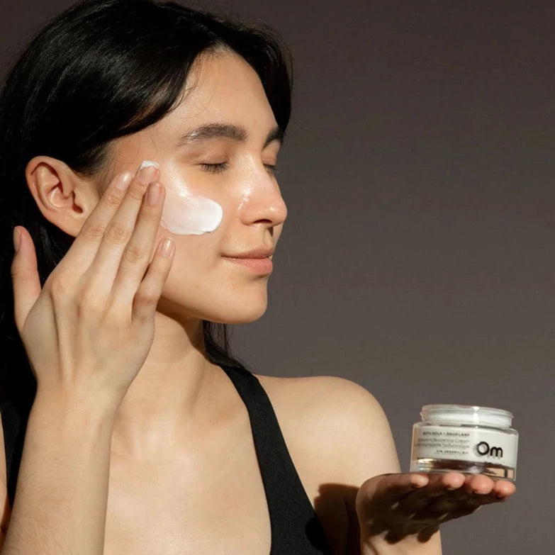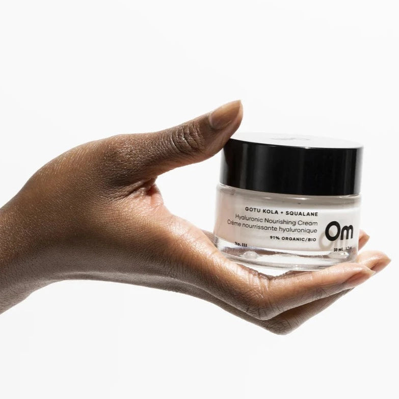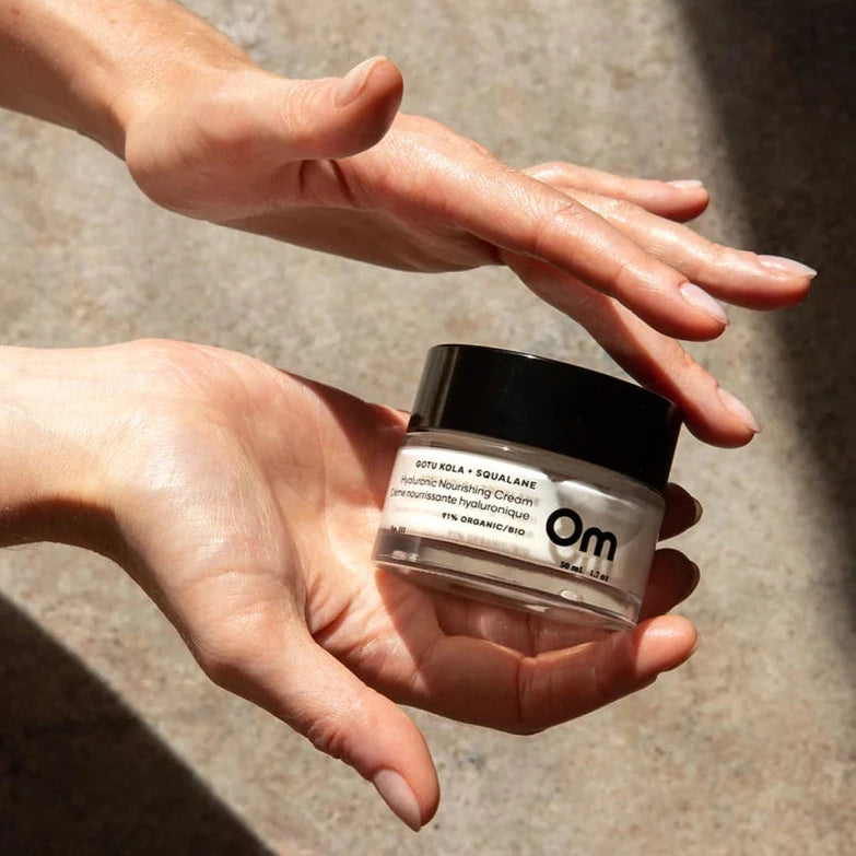 A deeply nourishing cream that leaves skin thoroughly moisturized, soft and supple. If you love Om's Coconut Dew moisturizer, but you live in a drier climate or have seen a few more years, this one's for you. Om's second decadent face cream has been designed just for you with a similar texture and effectiveness. Hyaluronic acid and olive squalane deliver deep hydration and long-lasting smoothness. Deep nourishment leaves your skin soft, radiant and thankful.