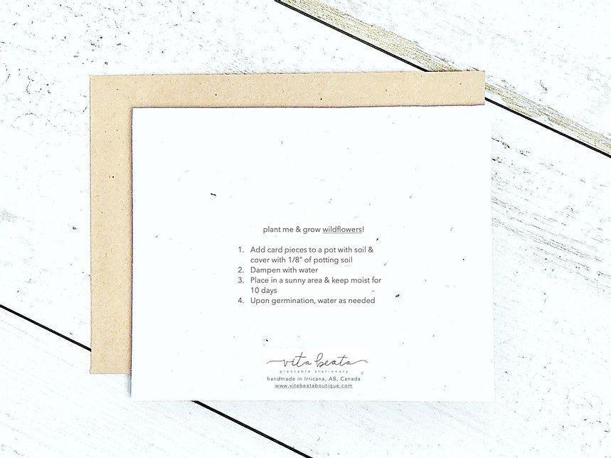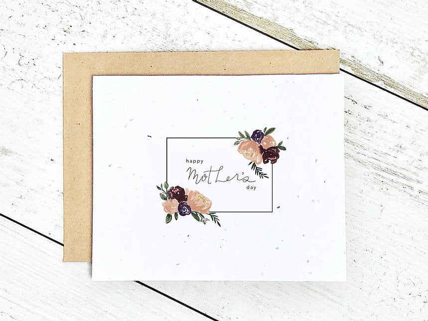 Make a lasting impression with this plantable, eco-friendly mother's day card! This is a hand-drawn design, generously seeded and made with 100% post-consumer materials. It will continue providing beauty as you watch wild flowers grow from what was once a mother's day greeting!