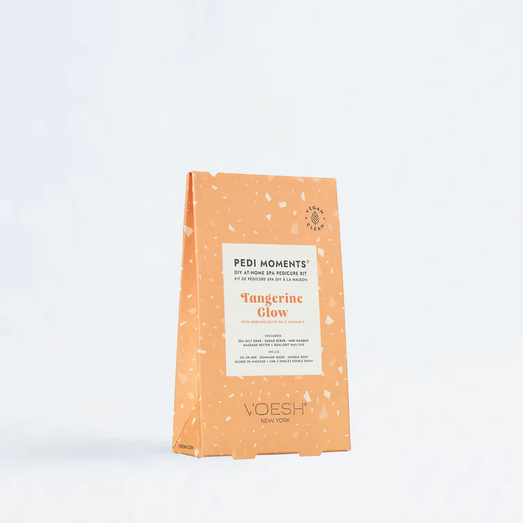 Boost your mood and your glow with Pedi Moments Tangerine Glow, a salon-worthy pedicure treatment. With one citrus-scented pedi kit and a dual-grit nail file, this at-home spa package has everything you need to rejuvenate your feet. Treat yourself to a revitalizing soak, gentle sugar scrub, purifying mud masque, and nourishing massage butter.