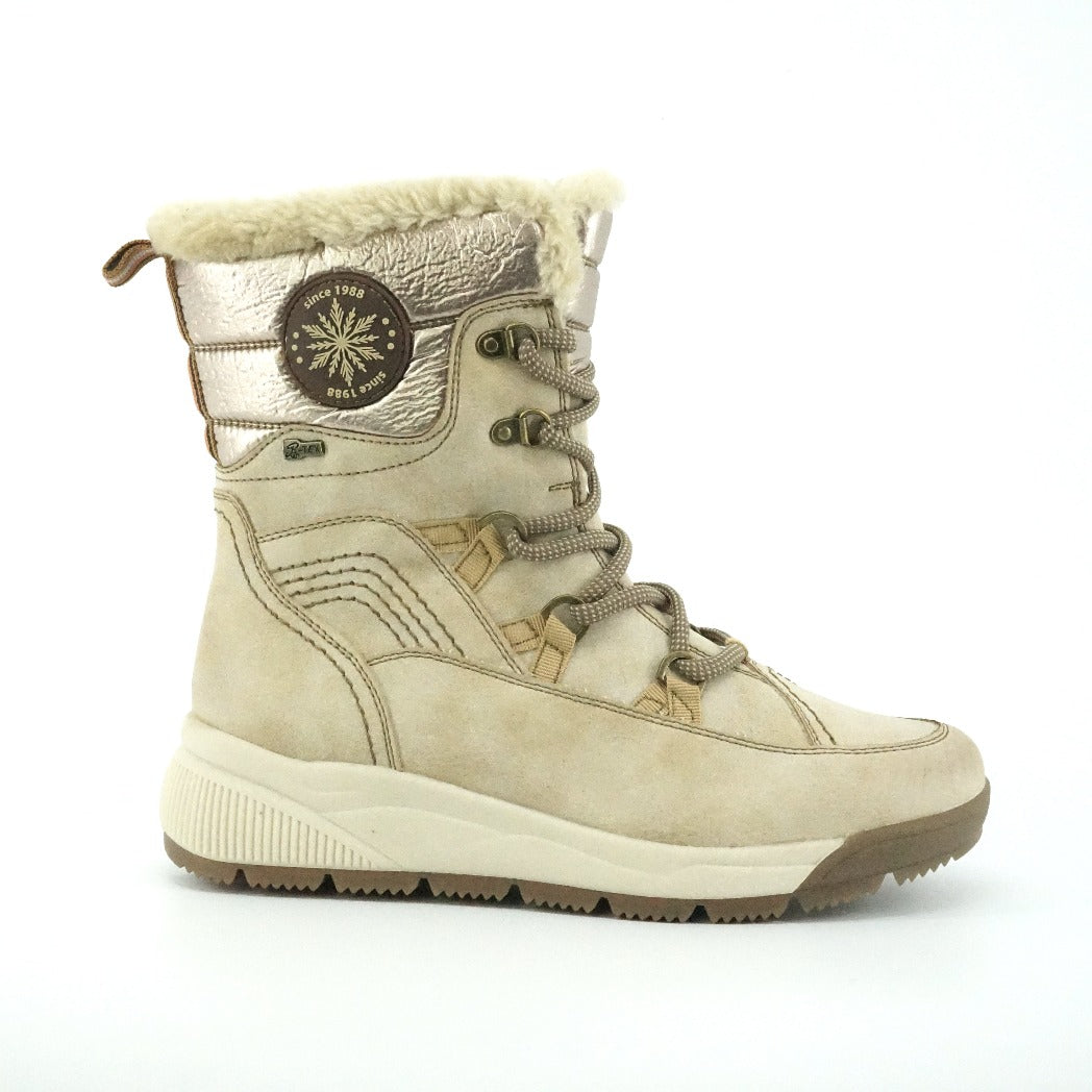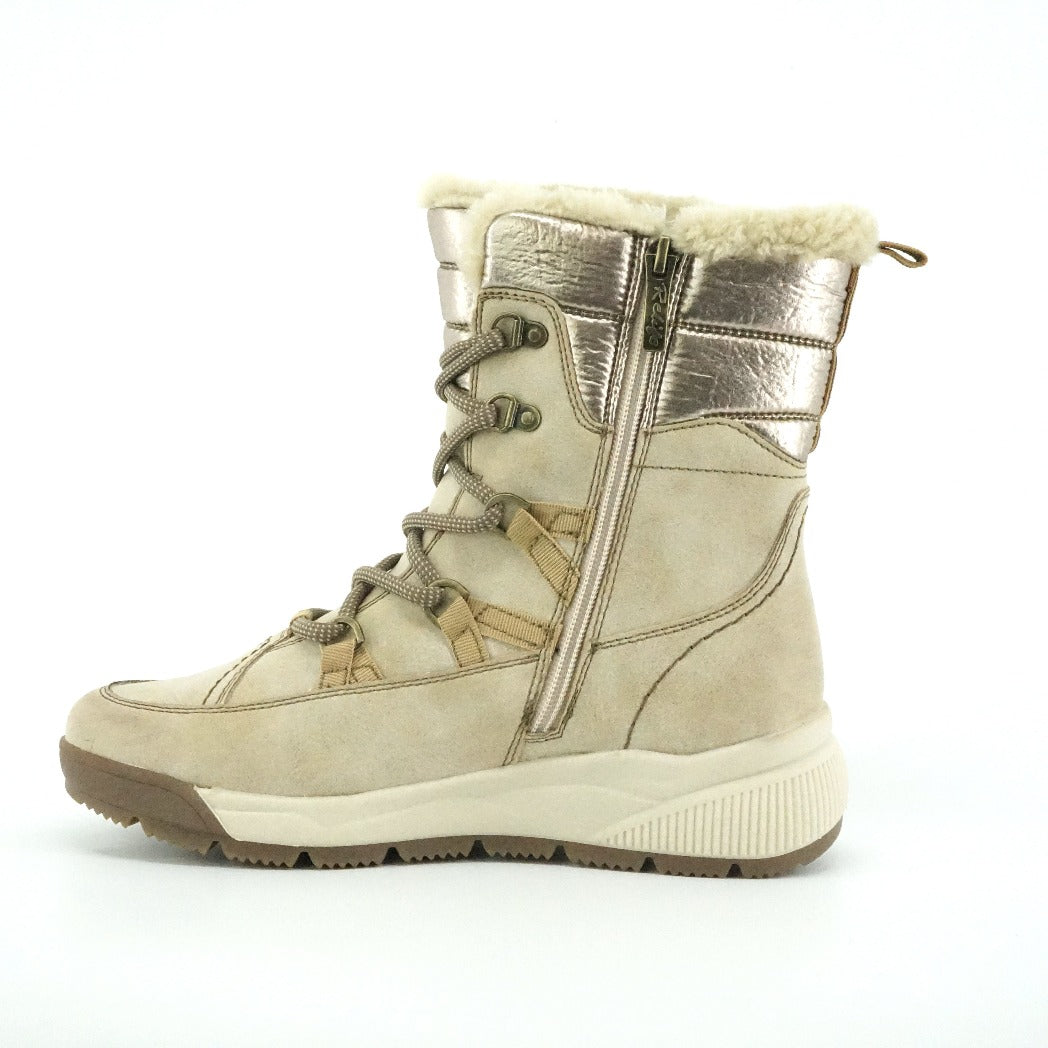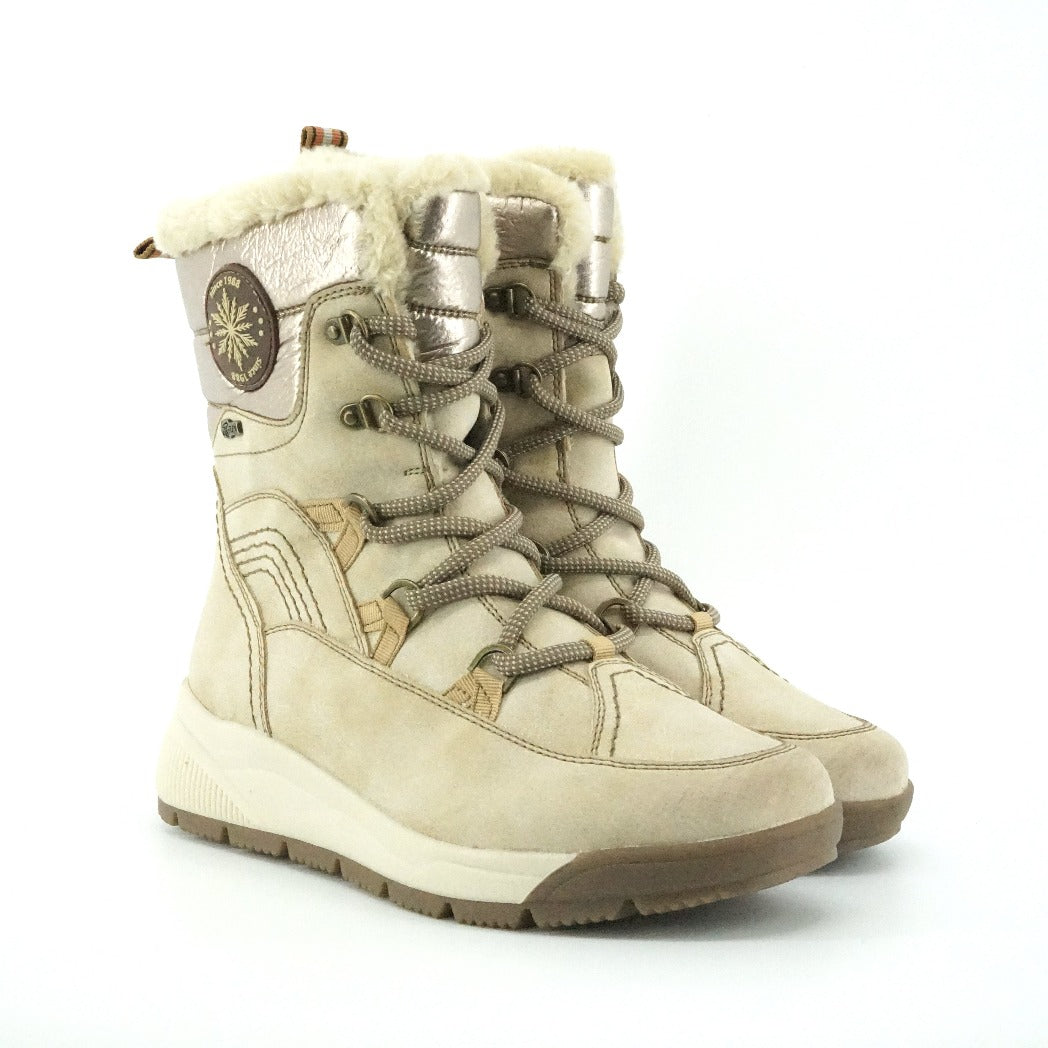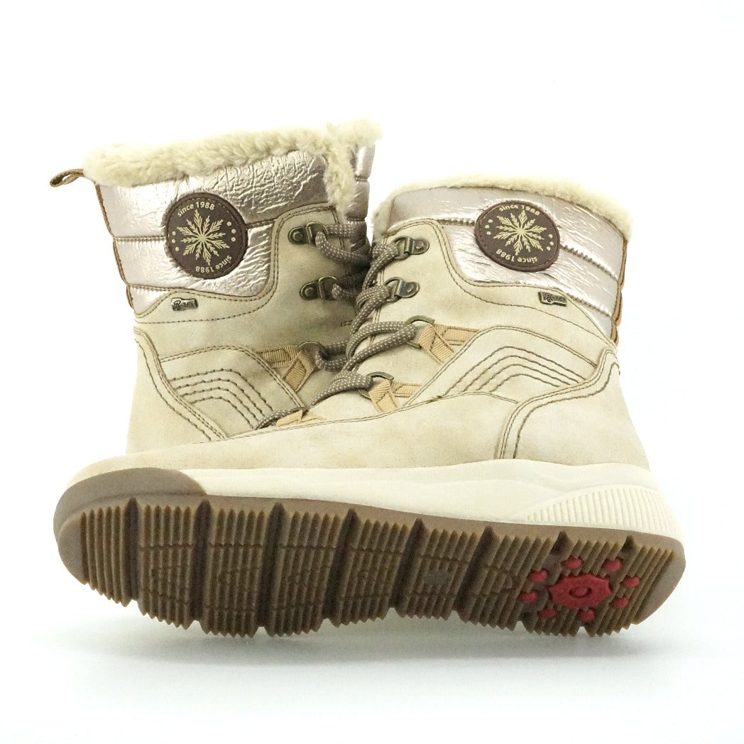 Mid-calf boots with inner side zipper allowing for easy in and out. Super comfortable with a faux shearling lining and shock absorbing insole. Grippy outsoles for stability in winter conditions. Water resistant.