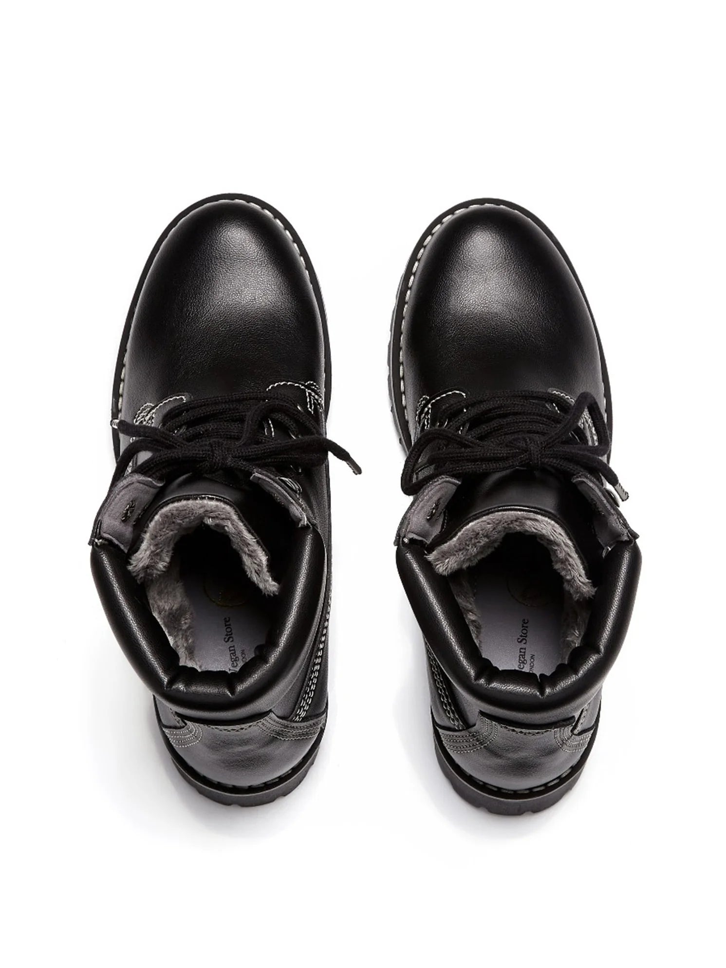 Built for warmth, comfort, and sustainability, our Women’s Insulated Dock Boots in Black combine rugged durability with everyday style. Made from Italian vegan leather (69% biobased content), these eco-friendly boots perform just as well on muddy trails as they do on city streets. The Primaloft® insulation (90% recycled) and soft vegan fur lining wrap your feet in cozy warmth, while the padded collar and secure lace hooks provide supportive comfort for long walks or hikes. Finished with deep-tread recycled outsoles for excellent grip, these boots are built to last for years of winter adventures—ethically crafted in Portugal and 100% vegan.